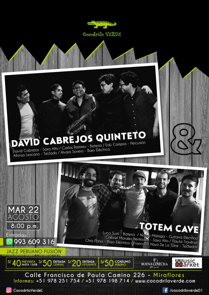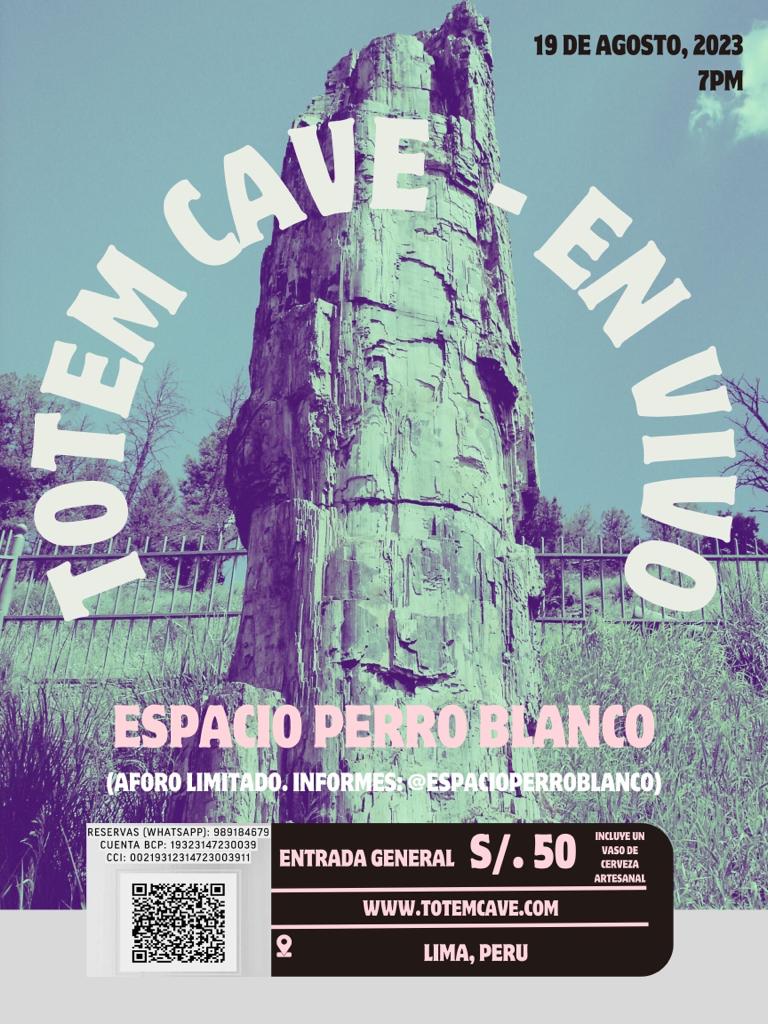 La gira limeña de Totem Cave promete ser imposible de olvidar, un festín para los amantes de la música en vivo, que podrán disfrutar de sus innovadores acordes de funk, jazz y rock. La banda tiene tres fechas en Lima, que no debes perderte. El 18 de agosto se presentarán en ‘La Milonga de Santito’, San Bartolo. El 19 de agosto en ‘Espacio Perro Blanco’, donde se incluirá un vaso de cerveza artesanal con la entrada general de S/ 50 soles. Y el 22 de agosto con el ‘Cocodrilo Verde’ de Miraflores, donde compartirán escenario con David Cabrejos Quinteto, destacado quinteto de la escena de jazz limeña. Las entradas para este último show están en pre-venta desde S/ 40 soles a través del WhatsApp 993 609 316.